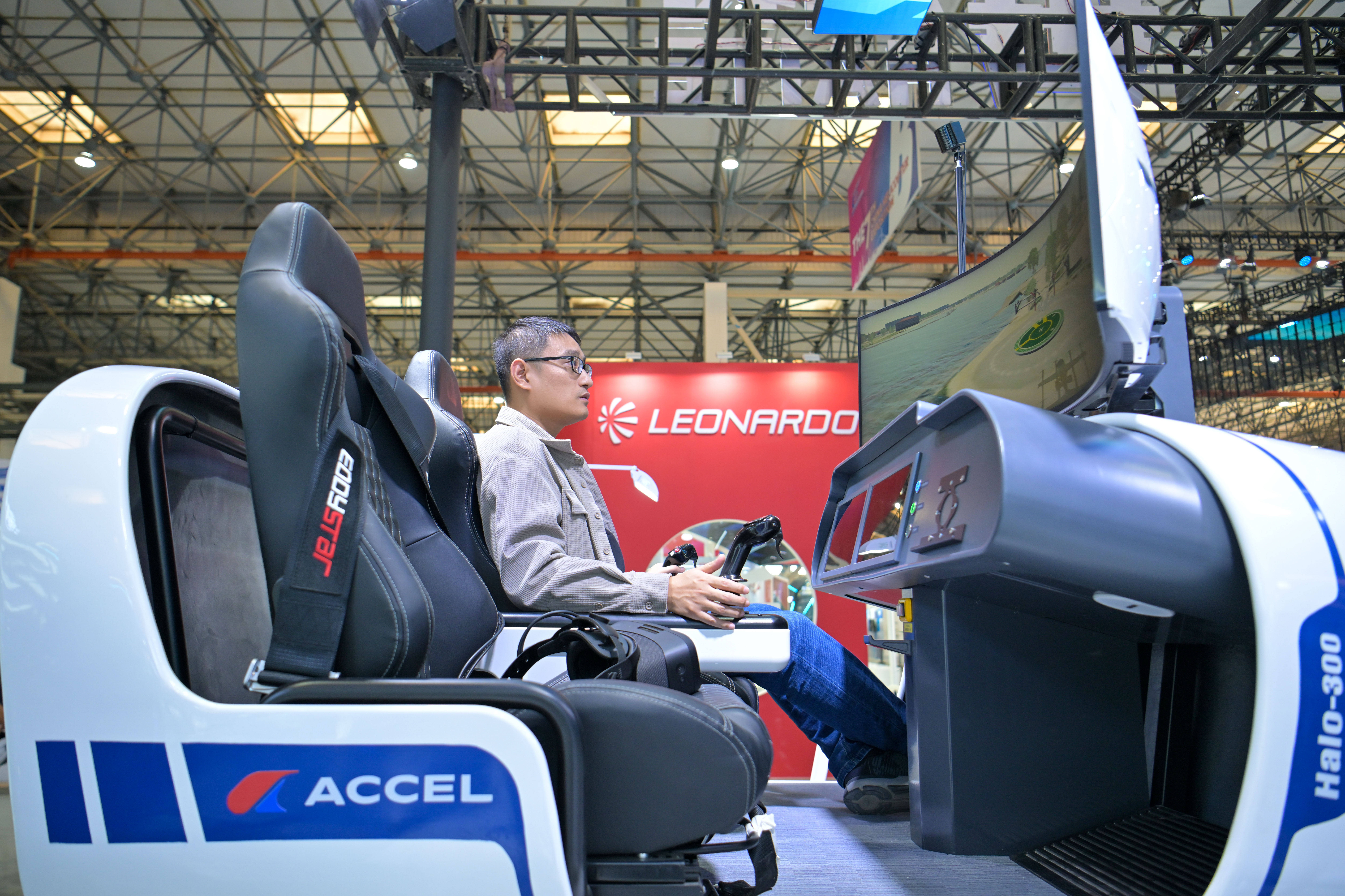 10月14日,工作人员在天津直博会直升机馆内调试模拟飞行体验设备。 新华社记者 孙凡越 摄