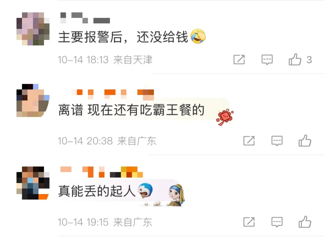 老板称,餐馆已报警,目前还未给钱。网友评论:
