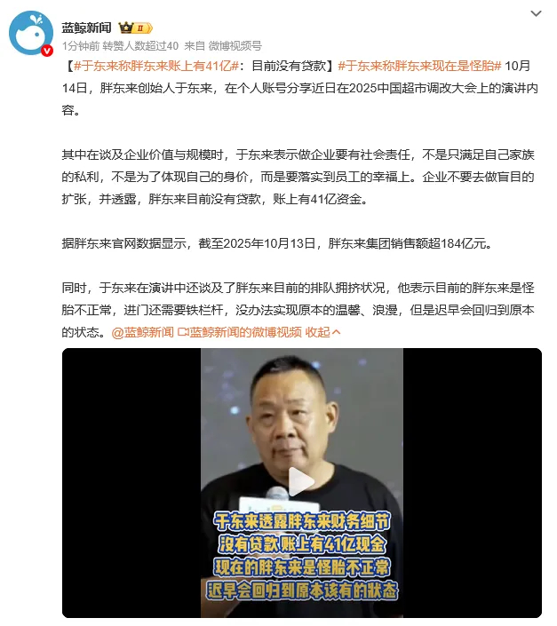 10月14日,胖东来创始人于东来,在个人账号分享近日在2025中国超市调改大会上的演讲内容。