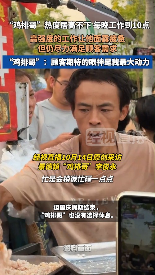 国庆假期期间,“鸡排哥” 的摊位热度居高不下,直至晚间 10 点,摊位周边仍人流不断。高强度的工作让他面露疲惫,他曾在个人社交账号坦言 “工作量大了,也会有略感疲惫的时候”。即便国庆假期结束,他也未选择休息。对于忙碌起来会不会有感觉坚持不下去的时候,10月14日晚 “鸡排哥” 回应称,国庆期间外地游客多,大家来景德镇旅游的同时来打卡“鸡排哥”,摊位虽然比平时忙,但大家的支持给了他坚持的动力。“会稍微忙一点点,工作量稍微偏大一点点,但是看到每位顾客在这里排队那么长的时间,看到这种期待的眼神,他们的支持才是我真正最大的动力。”