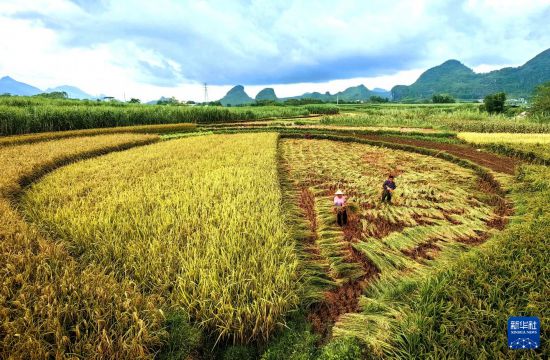 10月15日,广西来宾市忻城县城关镇泮水村农民在稻田里抢收稻谷。