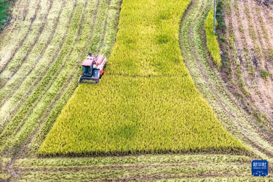 10月15日,在湖南省娄底市双峰县荷叶镇白泥村,农民驾驶农机收割晚稻(无人机照片)。