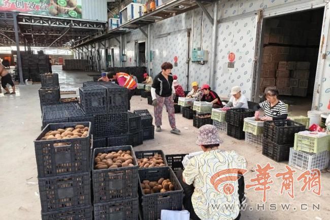 ▲龙飞果业合作社冷库建成后工人们正在分拣猕猴桃