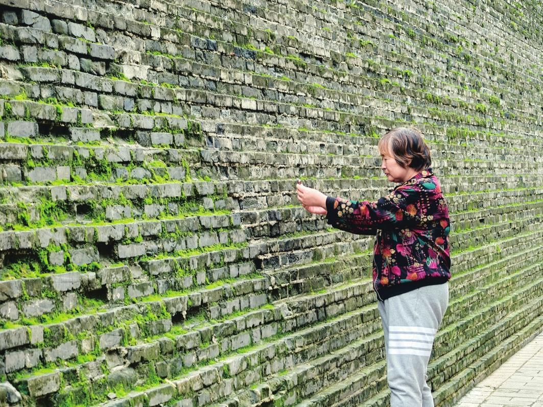 市民李女士说,她是看到社交平台上的视频后专程过来的,只见她先拍下青苔特写,随后调整角度自拍合影。
