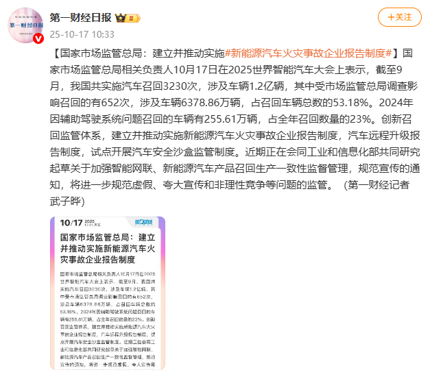 国家市场监管总局相关负责人10月17日在2025世界智能汽车大会上表示,截至9月,我国共实施汽车召回3230次,涉及车辆1.2亿辆,其中受市场监管总局调查影响召回的有652次,涉及车辆6378.86万辆,占召回车辆总数的53.18%。2024年因辅助驾驶系统问题召回的车辆有255.61万辆,占全年召回数量的23%。创新召回监管体系,建立并推动实施新能源汽车火灾事故企业报告制度,汽车远程升级报告制度,试点开展汽车安全沙盒监管制度。近期正在会同工业和信息化部共同研究起草关于加强智能网联、新能源汽车产品召回生产一致性监督管理,规范宣传的通知,将进一步规范虚假、夸大宣传和非理性竞争等问题的监管。