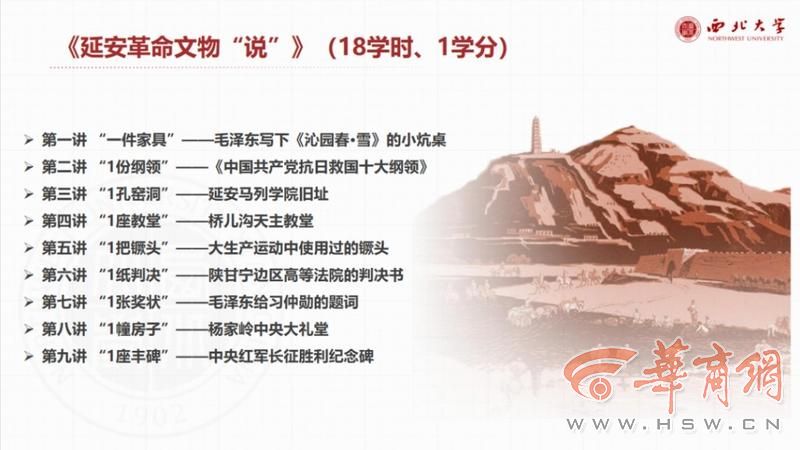 《延安革命文物“说”》以党中央在延安十三年的时间脉络为线索,选择最具代表性的革命文物,以“见物、见人、见故事、见精神、见理论”为逻辑,引导学生弘扬延安精神,使革命文物“活起来”。课程每一讲都采用 “线上1/4+线下3/4”的方式进行,即把1/4的课堂时间交给中央红军长征胜利纪念馆、中共西北局纪念馆、洛川会议纪念馆等革命纪念馆的同志,请他们线上讲活文物故事。西北大学老师在剩下的3/4时间里,讲深讲透文物背后的历史背景、文化内涵和精神价值,提升学生史料解读和历史思维能力,多维度形成独立的党史认知框架。