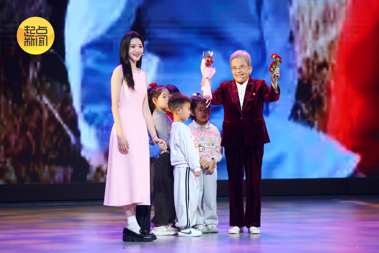 路生梅讲述完毕,演员刘浩存牵着小朋友们为路奶奶送上鲜花。