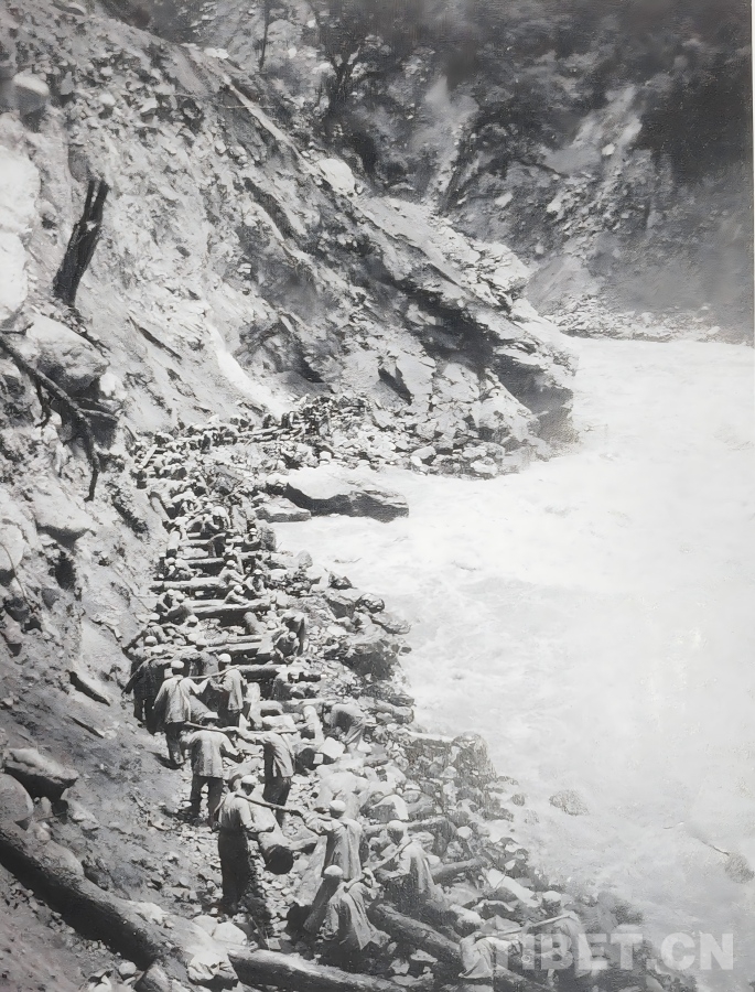 图为上世纪50年代初,康藏公路扎木路段(位于今波密与鲁朗之间)的筑路现场 作者供图