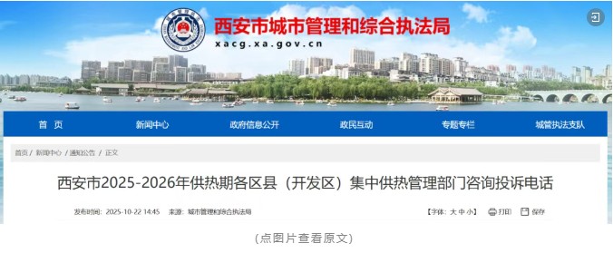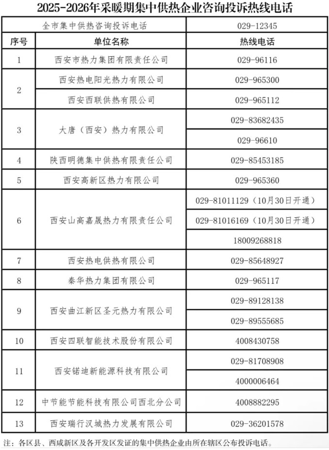 西安市2025-2026年供热期各区县(开发区)集中供热管理部门咨询投诉电话