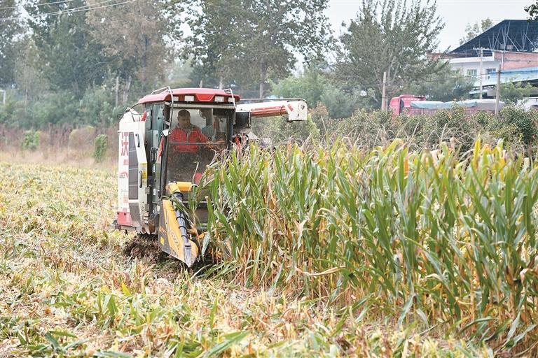 小图:10月21日,在陕西省三原县大程镇等桥村,履带式收割机在收获玉米。