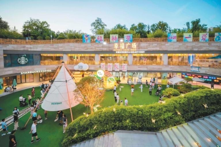2021年7月,经过几年的辛勤筹备和施工建设,幸福林带地上景观和地下商业建成开放,一幅万木葱茏、鸟语蝉鸣的美丽画卷徐徐铺展。