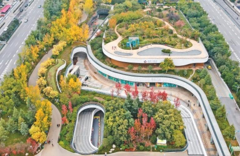 深秋的西安城东,一条绵延5.85公里的“绿色长廊”在阳光下舒展。金黄的银杏叶与苍翠的松柏交织,红绿相间的塑胶跑道和健身设施旁,居民们悠闲惬意;地下空间,34个“雨滴”天井如散落的珍珠串联起23个下沉广场,逛街的年轻人和听秦腔的大爷大妈们共享一片热闹……