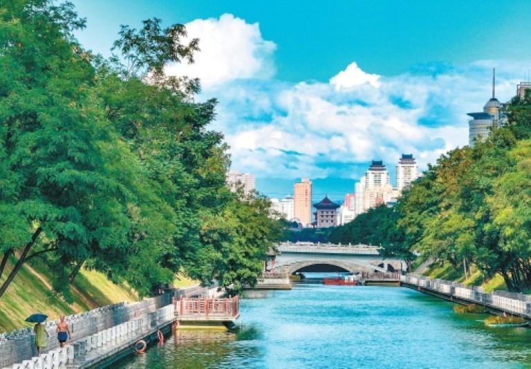 近年来,西安不断加大减污降碳力度,生态环境质量持续改善。图为水清岸绿的护城河。 资料图片