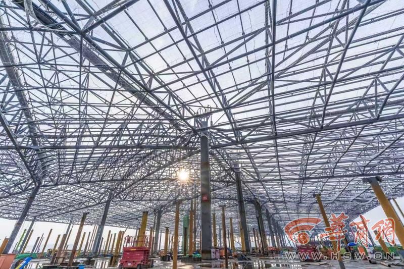 此次西安东站屋盖钢结构施工突破多项技术瓶颈,该屋盖采用全国首例山脊组合造型斜交空间管桁架结构,整体长400米、宽293米,投影面积达7.5万平方米,主桁架跨度89米,最高点与最低点标高相差11米,共有1.2万个焊接节点,构成复杂大跨度斜交空间管桁架结构体系。