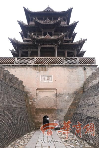 绕过献殿,秋风楼巍然立于高台之上,这座清代同治年间迁建的楼阁,仍保留明代风格,高32.6米,楼身三层四面各凸一间,砖木结构,28根吊柱暗合汉武帝云台二十八将,是后土祠的标志性建筑,也是全国现存最高大的元代楼阁式建筑,堪称古建瑰宝。秋风楼每层檐角都挂着铜铃,风一吹,“叮当”声清脆悠远。顶层东、西门额上有“瞻鲁”“望秦”匾额格外醒目。登楼凭栏远眺,蜿蜒黄河与汾河在不远处交汇,与《秋风辞》“泛楼船兮济汾河”意境完美重合。楼内藏着两块《秋风辞》碑刻,三层元至元八年的行草碑已裂,二层清同治年间的篆体碑刻完好无损。