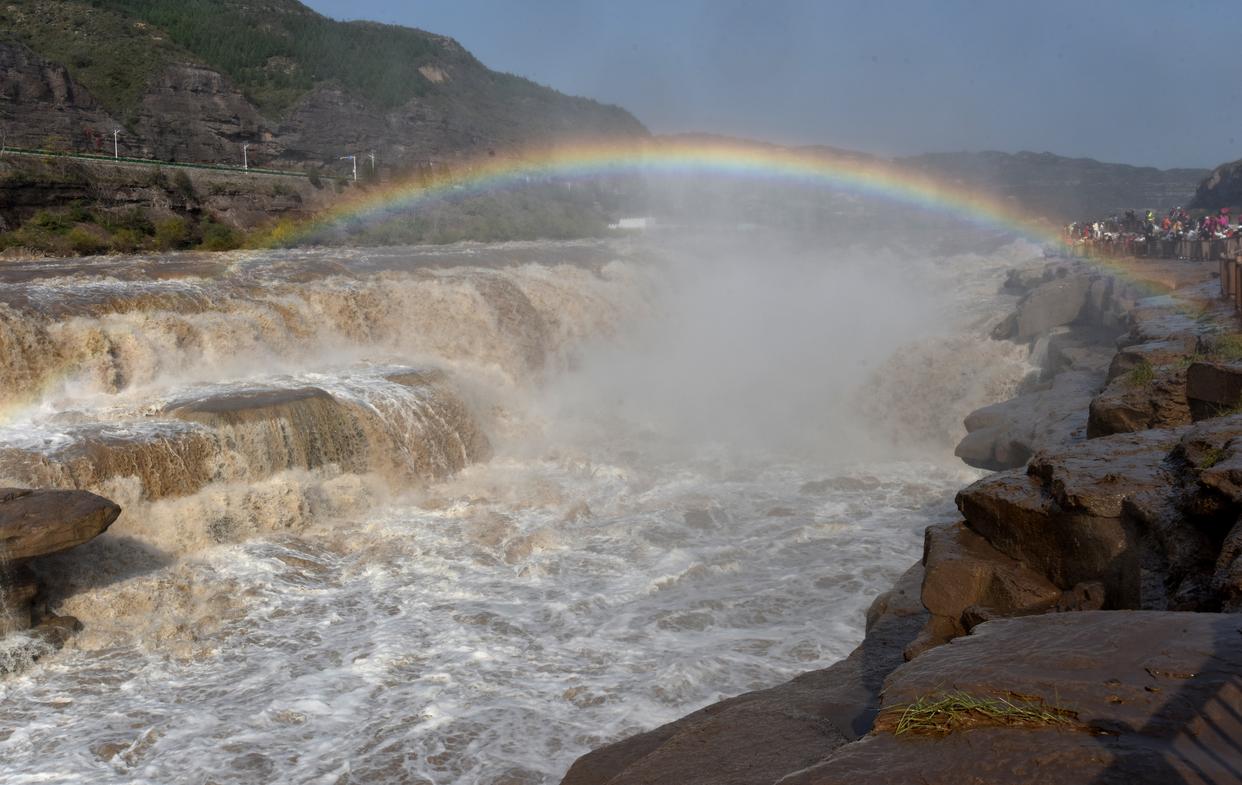 10月27日,位于山西吉县和陕西宜川县交界的黄河壶口瀑布景区天气晴好,飞溅的水雾在阳光照射下,形成一道壮美的“彩虹桥”。
