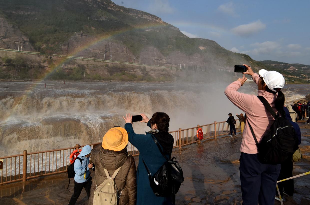 10月27日,游客在山西吉县黄河壶口瀑布景区欣赏“彩虹桥”景观。 新华社发(吕桂明 摄)