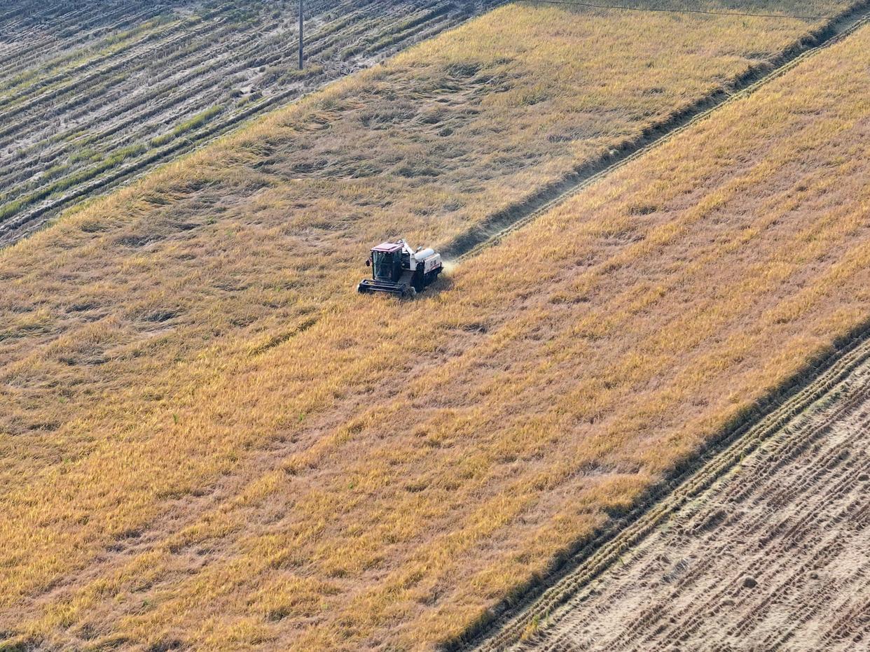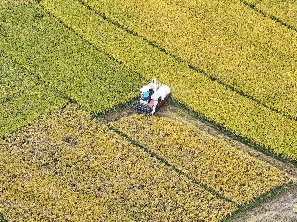 10月28日,湖南省永州市道县梅花镇棠下村,农机手驾驶机械收割晚稻(无人机照片)。新华社发(蒋克青 摄)