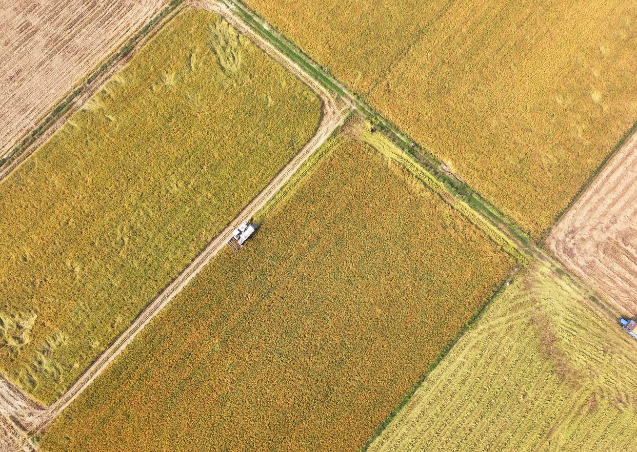 10月26日,农民驾驶收割机在江苏省兴化市周庄镇王官村收割晚稻(无人机照片)。新华社发(周社根 摄)