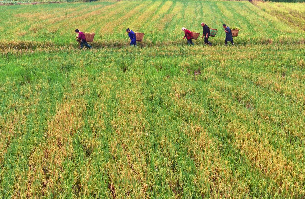 10月26日,在四川省眉山市仁寿县慈航镇观音社区,村民在转运收获的再生稻(无人机照片)。新华社发(潘建勇 摄)