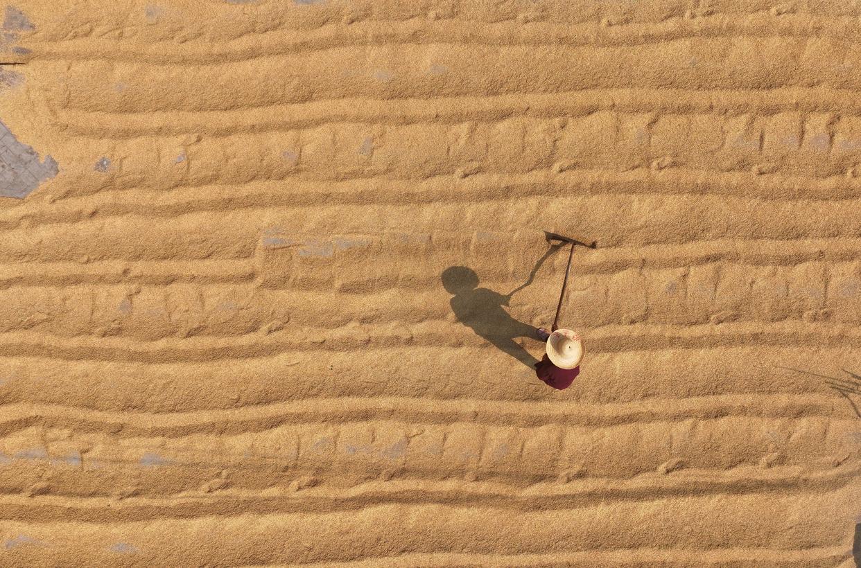 10月28日,在湖南省衡阳市衡山县白果镇,当地村民晾晒稻谷(无人机照片)。新华社发(曹正平 摄)