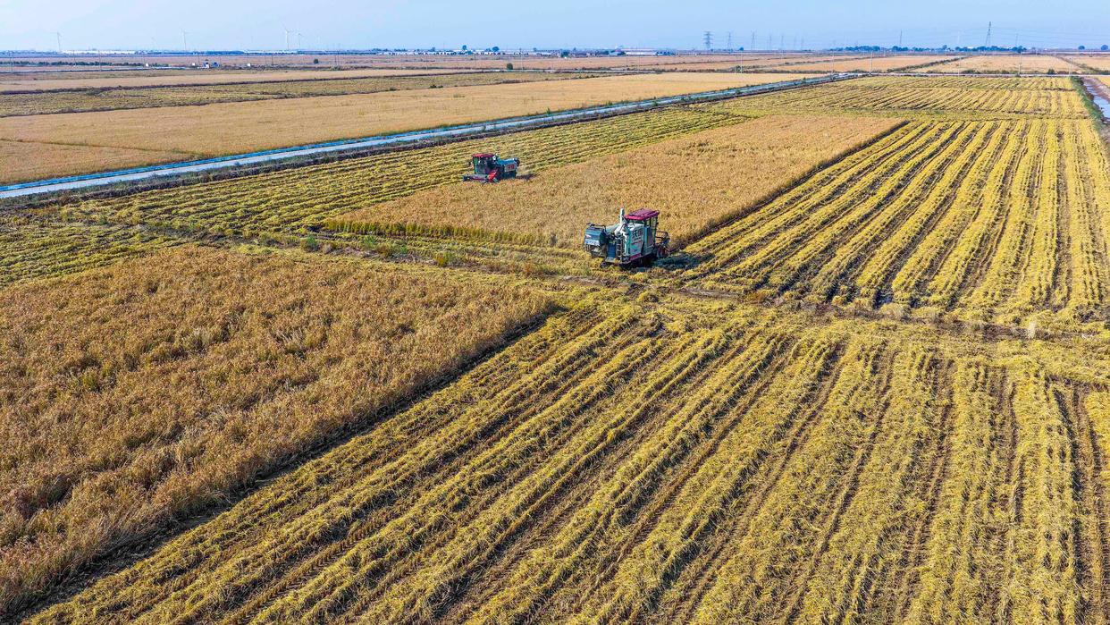 10月27日,河北省唐山市海港经济开发区王滩镇农民驾驶农机在收获水稻(无人机照片)。新华社发(刘满仓 摄)