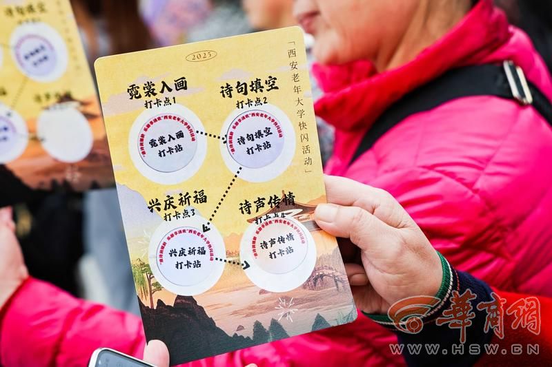 上午10时30分,兴庆宫公园龙堂广场上,重阳节快闪活动在热烈的掌声中拉开帷幕。现场围绕广场设置了四个主题打卡点:“霓裳入画”“诗句填空”“兴庆祈福”和“诗声传情”。老年朋友们通过参与互动游戏集章打卡,完成任务后可获得通关奖励。
