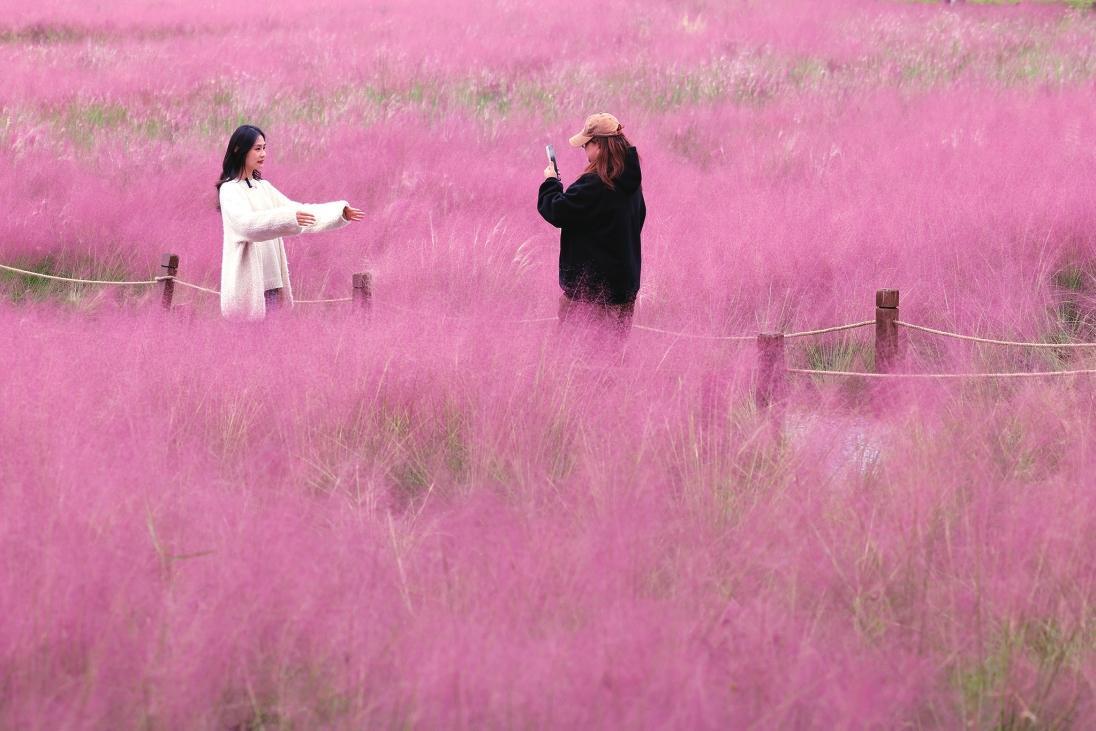 10月21日,汉长安城未央宫遗址公园里,连片粉黛乱子草随风摇曳。