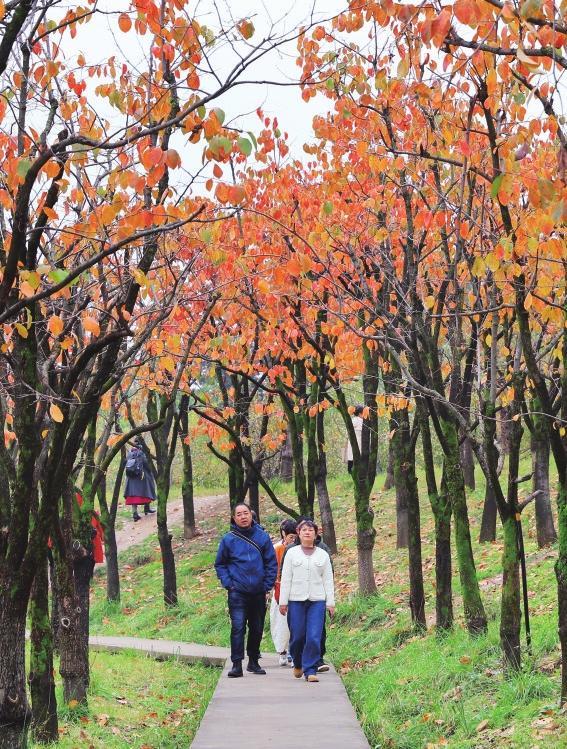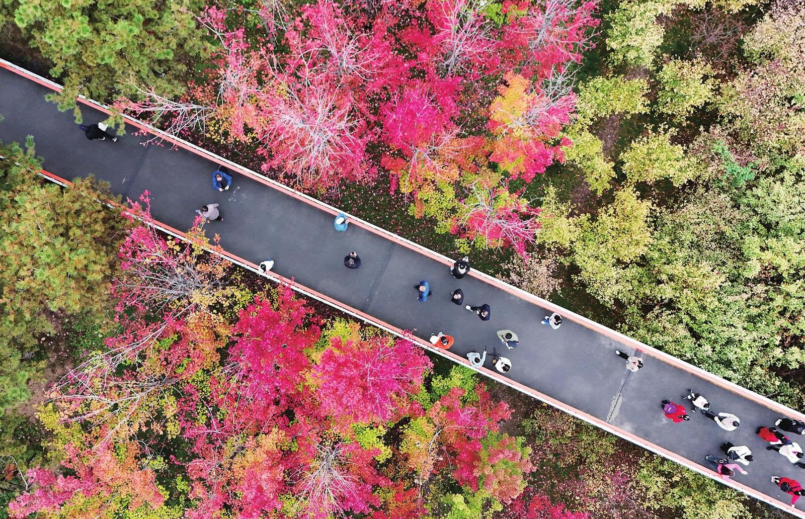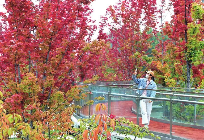 10月21日,西安市雁南公园内枫叶似火,市民穿行其间,沉醉于这满目秋红。