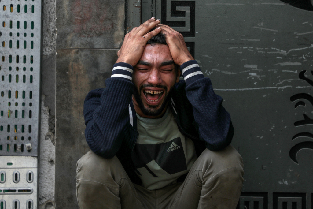 10月29日,一名巴勒斯坦人在加沙城的希法医院痛哭,哀悼在以色列空袭中死难的亲友。新华社 图