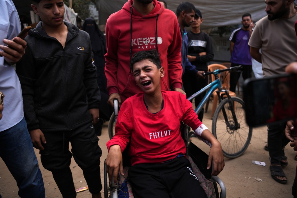 10月29日,在加沙地带中部的努赛赖特一家医院,一名少年为在以色列军袭击中身亡的父亲痛哭。