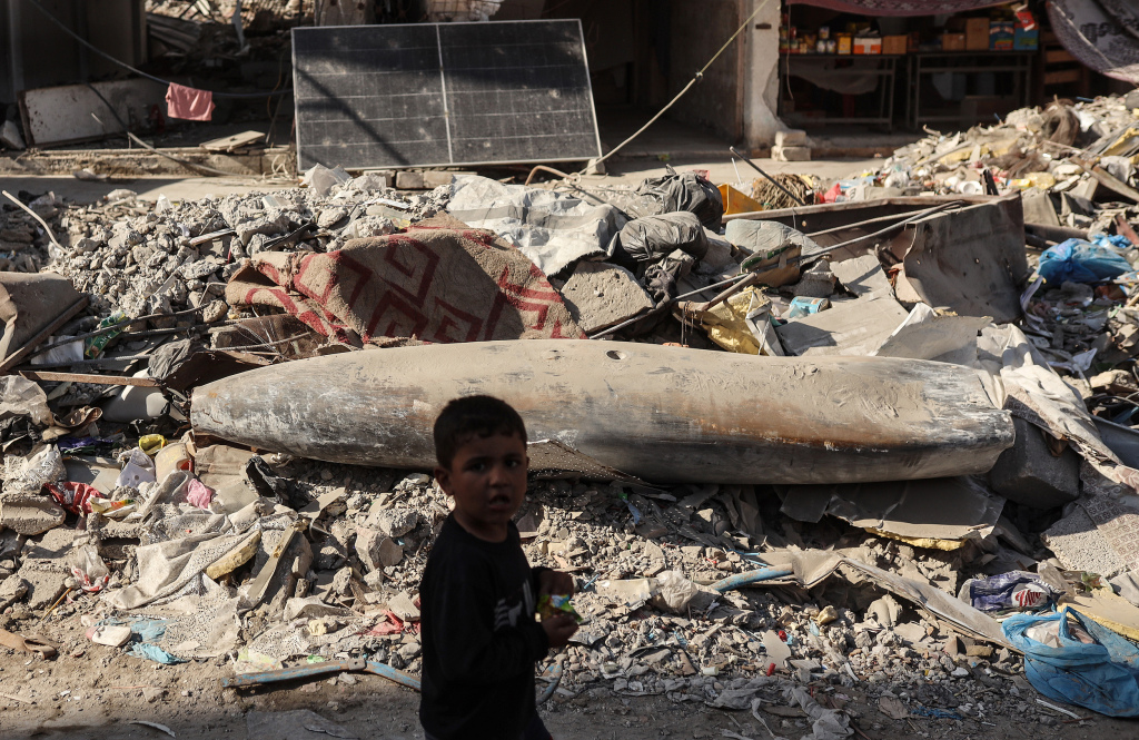 10月30日,加沙城,一名巴勒斯坦男孩走过街头,身后是一枚以色列火箭弹。