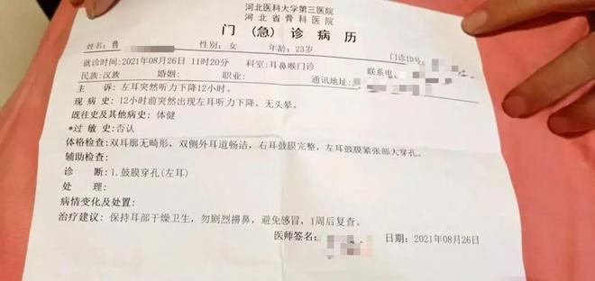 曹莹父亲提供的一份2021年8月的病历显示,曹莹左耳听力突然下降12小时,被诊断为鼓膜穿孔。曹父称,这是被刘华掌掴所致,事发后他们本想报警,但女婿下跪认错,女儿也担心案底会影响孩子,最终原谅了对方。