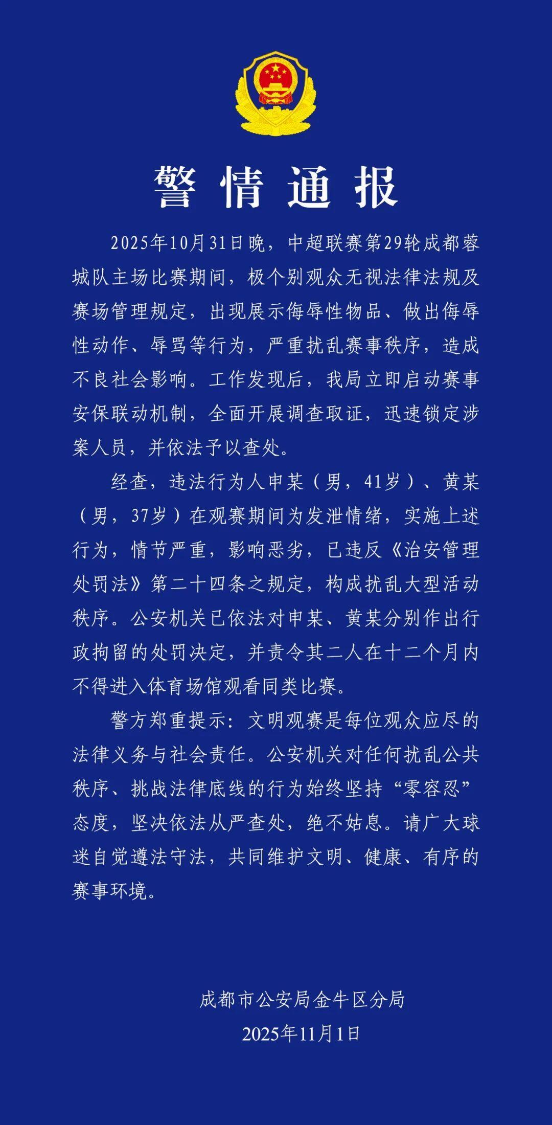 2025年10月31日晚,中超联赛第29轮成都蓉城队主场比赛期间,极个别观众无视法律法规及赛场管理规定,出现展示侮辱性物品、做出侮辱性动作、辱骂等行为,严重扰乱赛事秩序,造成不良社会影响。工作发现后,我局立即启动赛事安保联动机制,全面开展调查取证,迅速锁定涉案人员,并依法予以查处。