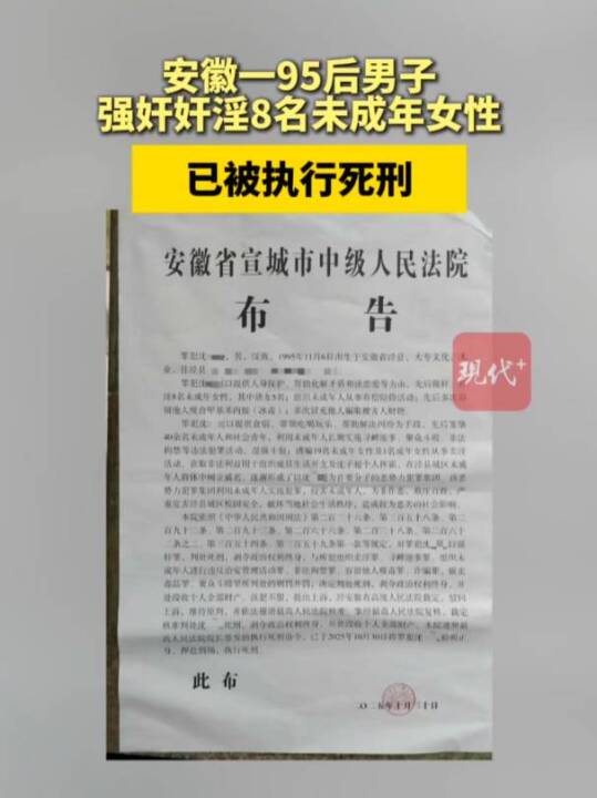 11月3日,记者从安徽省宣城市中级人民法院了解到,宣城一95后男子沈某因强奸多名未成年女性,其中含5名幼女,同时利用未成年人长期实施寻衅滋事、聚众斗殴、非法拘禁等违法犯罪活动,10月30日已被执行死刑。