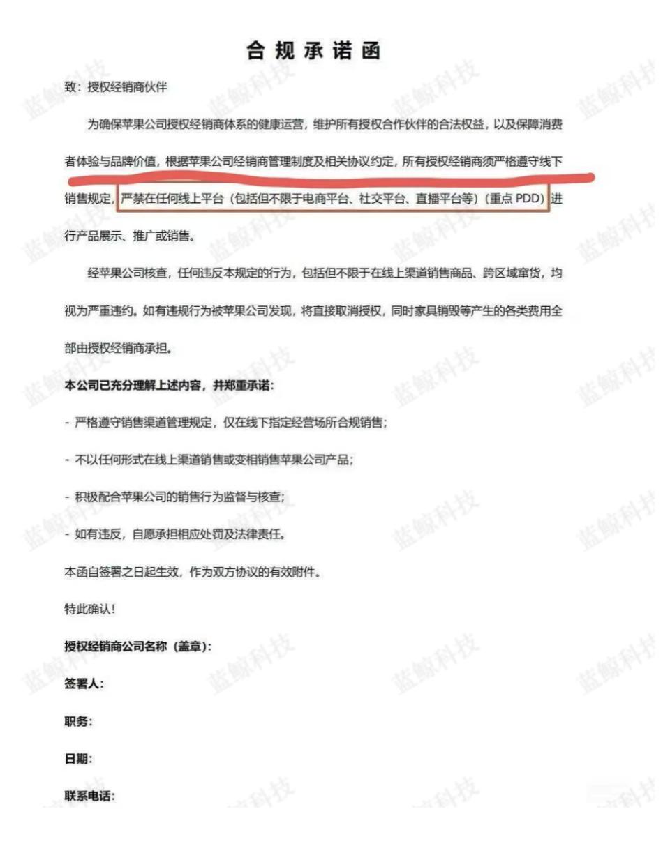 11月4日电,记者从一位苹果线下经销商处获悉,近日苹果中国区再次向授权经销商发布通知,要求所有线下授权经销商不得与任何电商平台合作,严禁在电商、社交、直播等线上平台进行产品展示、推广或销售,含一件达、小时达等服务。