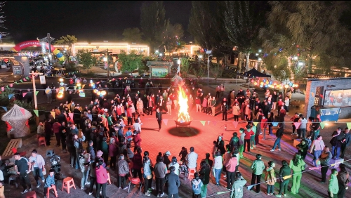 游客和村民们在宁夏吴忠白寺滩村碧玉广场举办篝火晚会。
