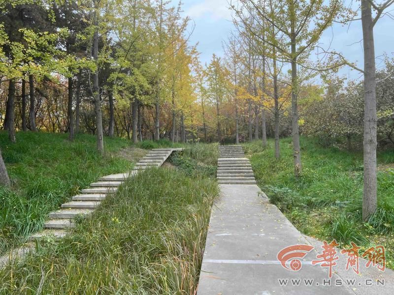 顺着自行车道一路畅行,但该步道只在公园最外圈,尽管每隔一段都有深入景区的观景步道,但从西沣北路到沈家桥一路的观景步道都只有台阶,未设置无障碍通道,虽然台阶不多,但对行动不便的老人显得不友好。