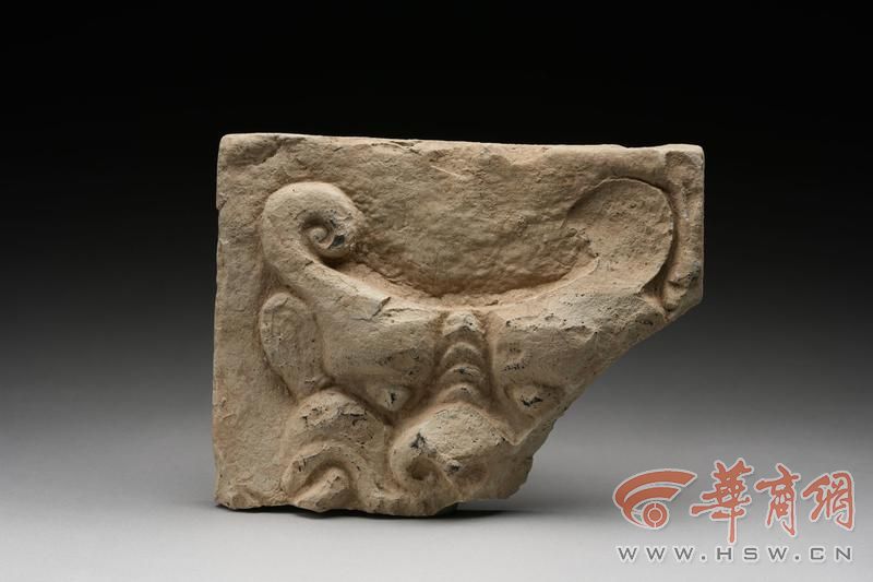 建筑构件约10件,包括瓦当、条砖、板瓦、脊头砖等,均为泥质灰陶。其中瓦当共6件,包括复瓣莲花纹和单瓣莲花纹;花边板瓦1件,瓦头立面有一道沟槽,形成上、下两条边,每条边间隔均捏出水波状花边;脊头砖1件,呈方形,背面光平,正面浮雕兽面。兽面凸眼,双角立卷,竖耳仰鼻,卷须,獠牙外露,面目狰狞。