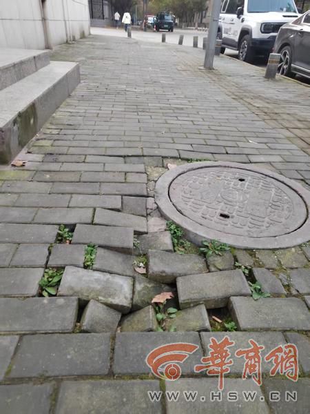 11月9日下午,华商报大风新闻记者来到康宁路西口看到,路南人行道上有一片地面坑洼不平,碎裂的砖块散乱铺在里面;沿该处往康宁路走,雁东供热有限公司大门外西边人行道上有两处破损,其中一坑洼里面放了两个断裂的阻车石,另供热公司收费点外两处井盖周边,多块地砖出现下陷,两个阻车石破损后倒在人行道上,存在一定安全隐患。