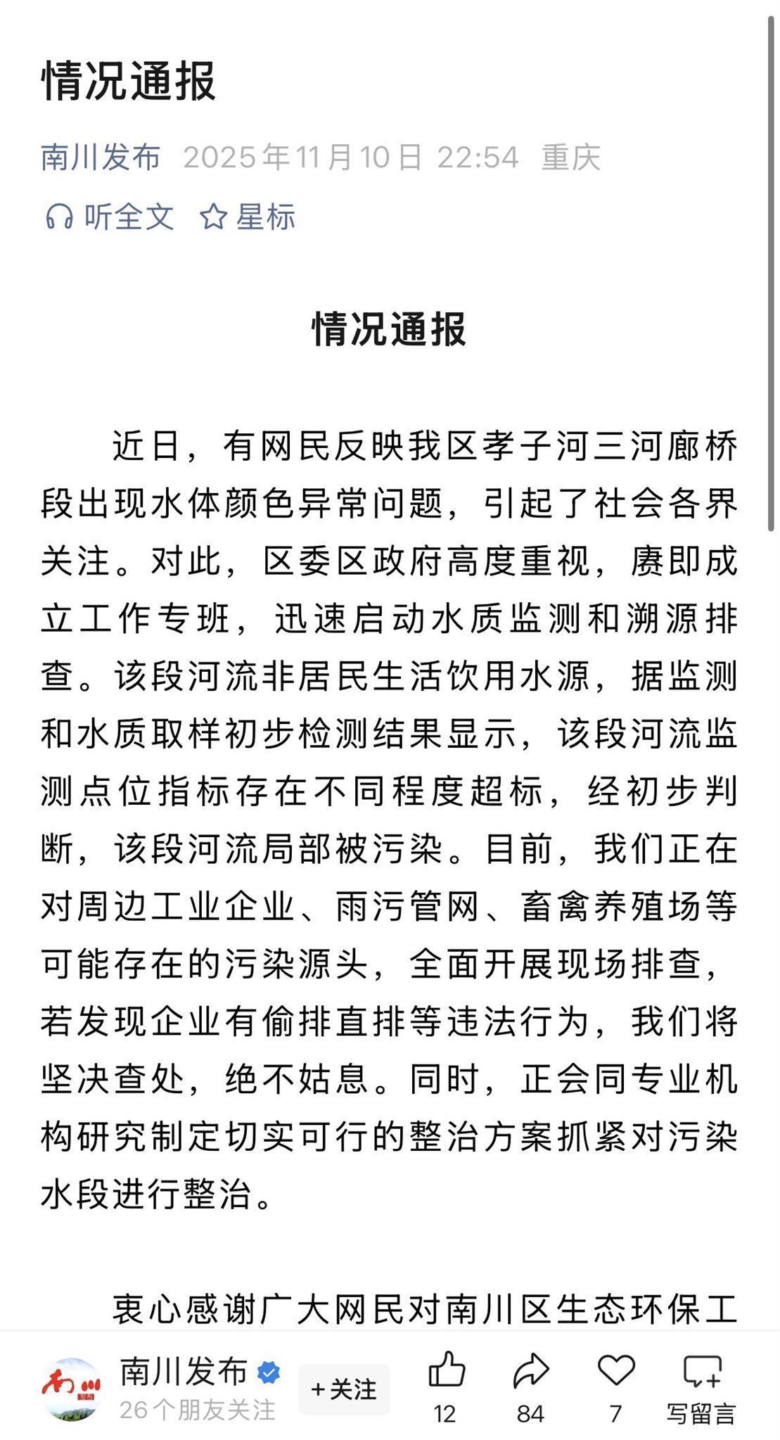 10日深夜,南川区发布情况通报:“近日,有网民反映我区孝子河三河廊桥段出现水体颜色异常问题,引起了社会各界关注。对此,区委区政府高度重视,赓即成立工作专班,迅速启动水质监测和溯源排查。
