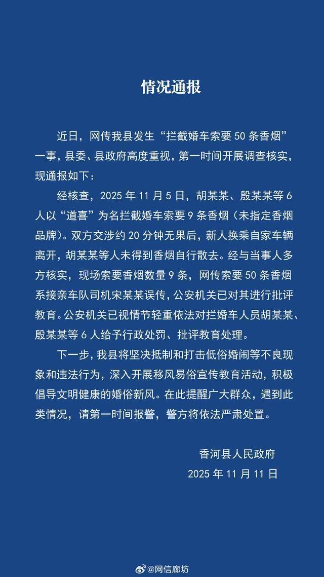 经核查,2025年11月5日,胡某某、殷某某等6人以“道喜”为名拦截婚车索要9条香烟(未指定香烟品牌)。双方交涉约20分钟无果后,新人换乘自家车辆离开,胡某某等人未得到香烟自行散去。经与当事人多方核实,现场索要香烟数量9条,网传索要50条香烟系接亲车队司机宋某某误传,公安机关已对其进行批评教育。