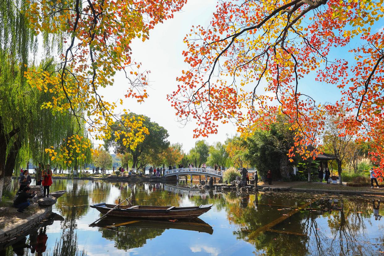 11月12日,游客在南京莫愁湖公园赏景游玩。新华社发(苏阳摄)