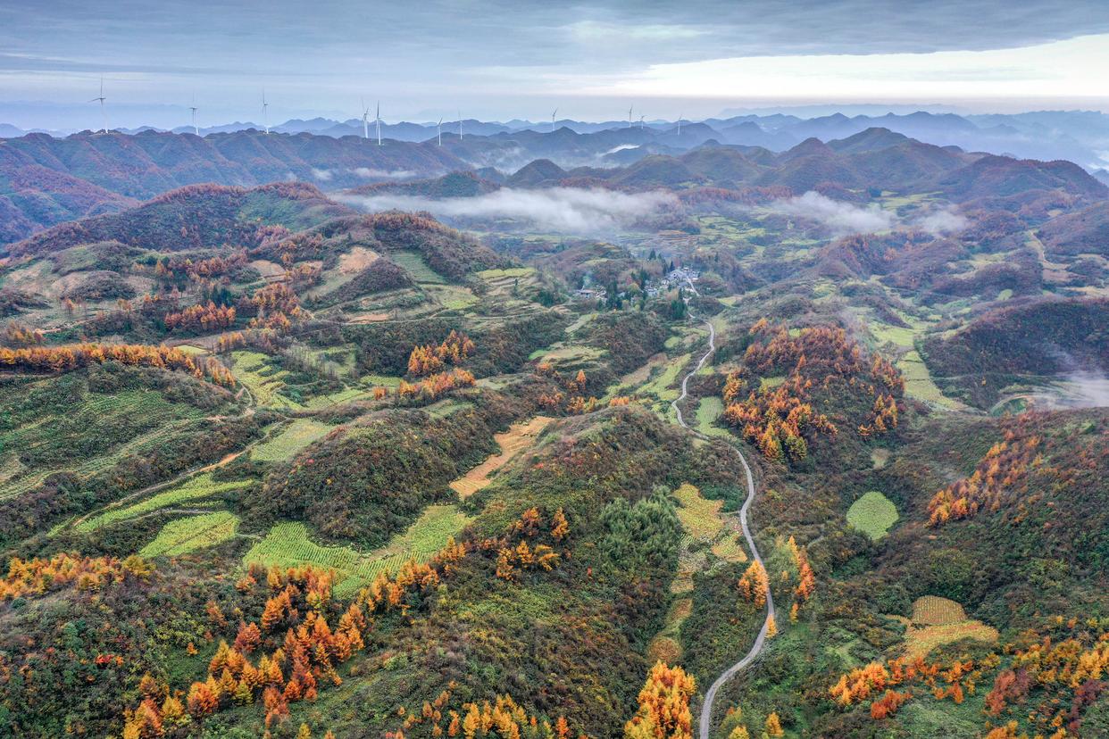 11月12日拍摄的湖南省湘西土家族苗族自治州龙山县大安乡翻身村景色(无人机照片)。新华社发(曾祥辉摄)