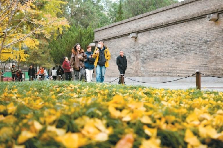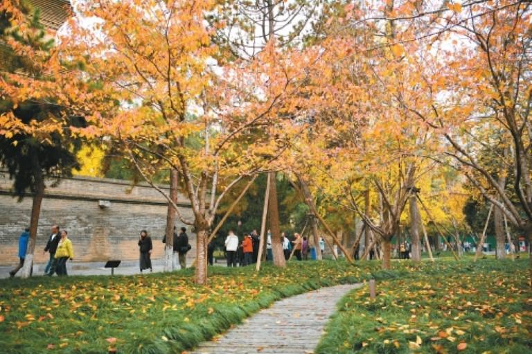 在小雁塔景区内,市民游客在银杏林中尽情享受美景。 记者郝钟毓 李明摄