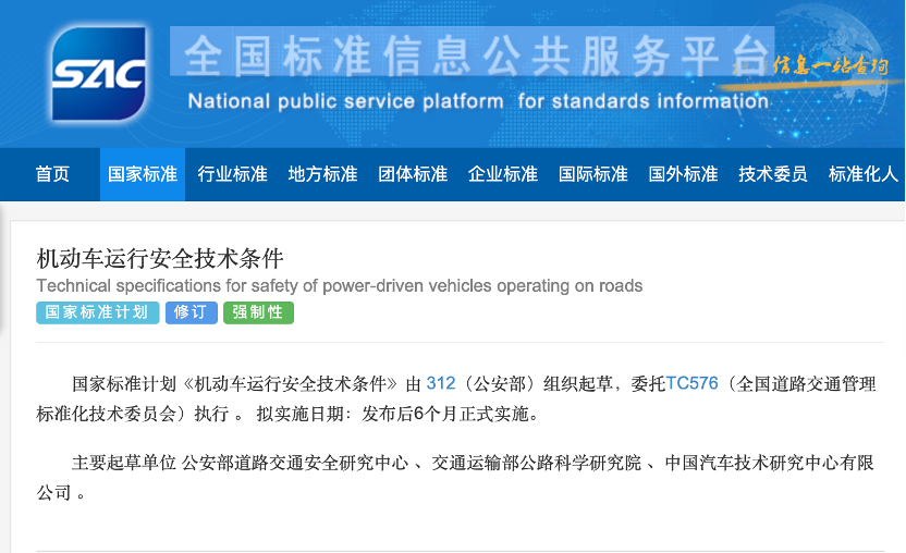 11月12日,据全国标准信息公共服务平台官网,公安部组织起草的国家标准计划《机动车运行安全技术条件》向社会征求意见。该标准主要起草单位有公安部道路交通安全研究中心、交通运输部公路科学研究院、中国汽车技术研究中心有限公司,拟在征求意见稿发布后6个月正式实施,替代现行的GB 7258。