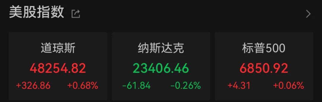 Wind数据显示,截至当日收盘,道指报48254.82点,涨幅为0.68%,再创历史新高;标普500指数报6850.92点,涨幅为0.06%;纳指报23406.46点,跌幅为0.26%。