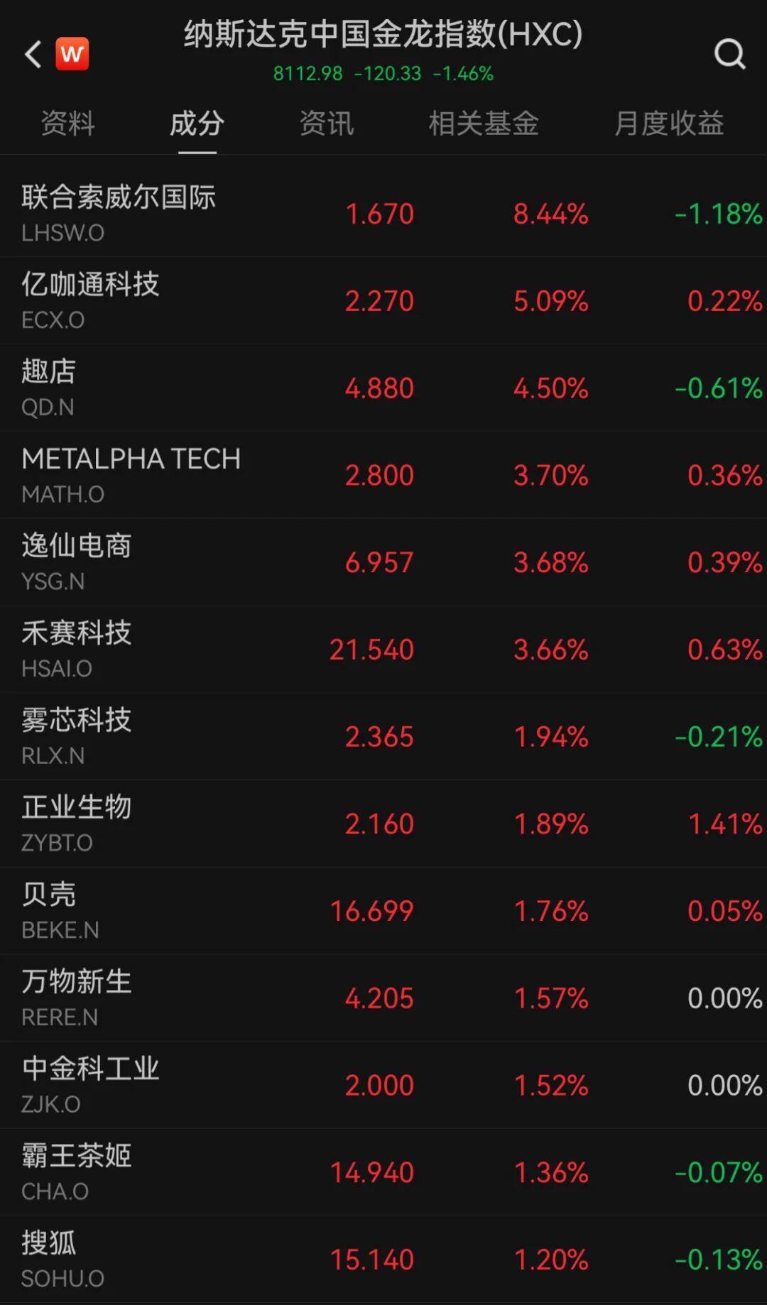 Wind数据显示,截至收盘,纳斯达克中国金龙指数下跌1.46%。其中,联合索威尔国际大涨8.44%,亿咖通科技涨超5%,逸仙电商、禾赛科技涨超3%,雾芯科技、贝壳、霸王茶姬、搜狐等涨超1%;新氧大跌12.35%,腾讯音乐、世纪互联等跌超8%。
