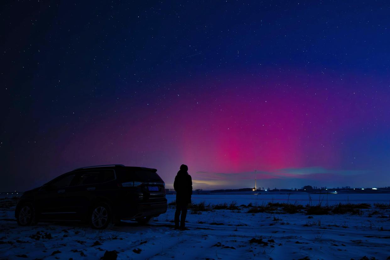 11月12日,在位于黑龙江省黑河市的北大荒集团北安分公司长水河农场有限公司,摄影爱好者在观看绚丽极光。新华社发(钱泊羽 摄)