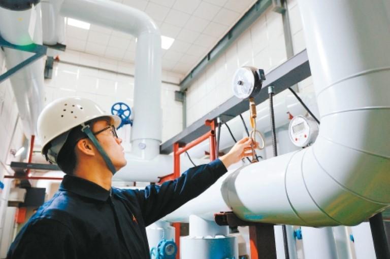 在一小区换热站,热力工作人员仔细查看各项设备运行情况。